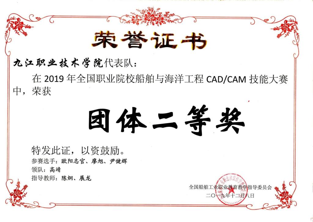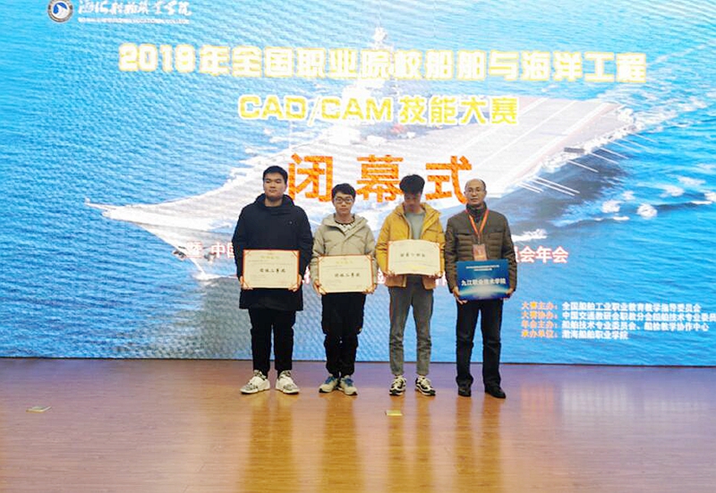 九江职院新闻网讯(船舶工程学院)12月7日,2019年全国职业院校船舶与海洋工程CAD/CAM技能大赛在渤海船舶职业学院举行,由我校船舶工程学院教师陈炯、展龙指导,学生欧阳志官、廖旭、尹健辉组成的参赛团队荣获团体二等奖。